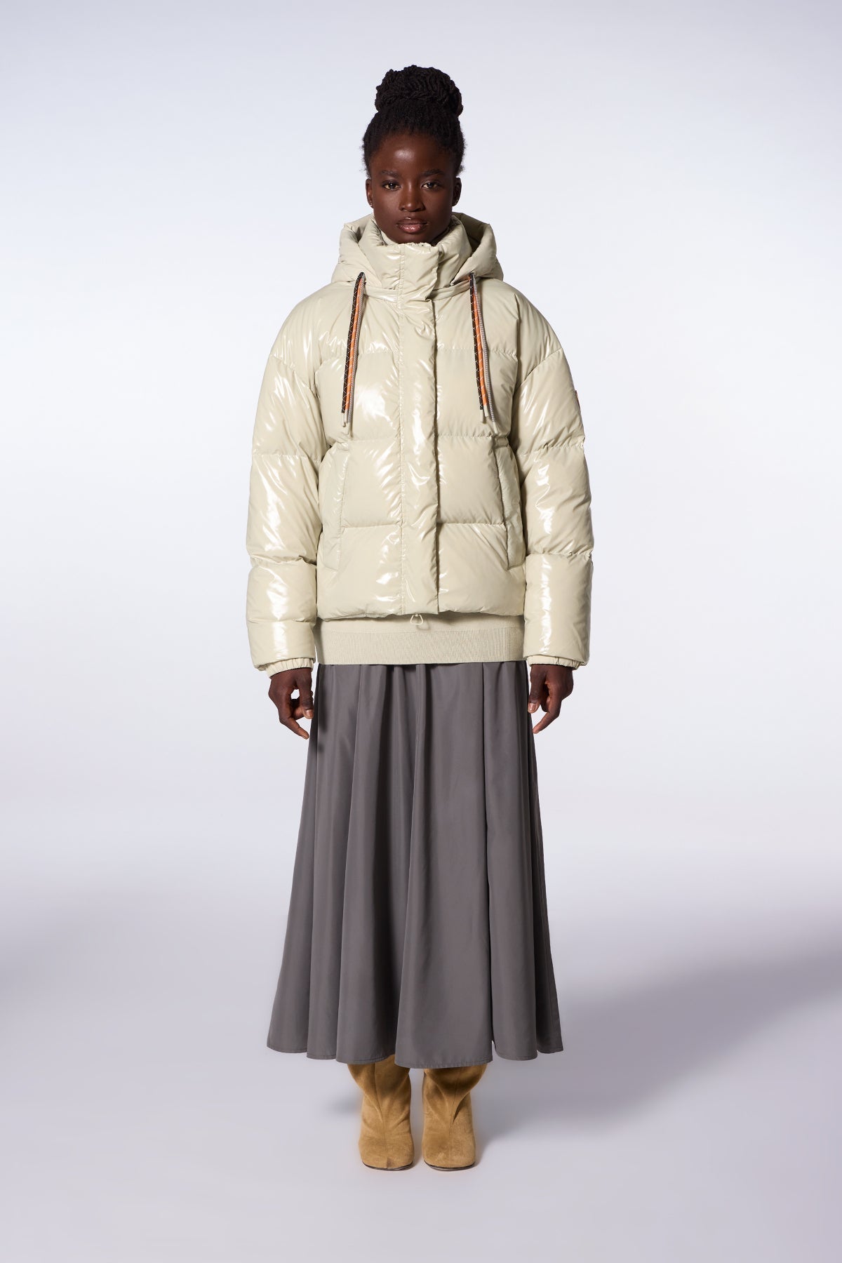 LILI BRIGHT est une doudoune courte confectionnée en nylon glossy. La capuche est amovible et ajustable grâce un triple cordon. Les manches tombantes sont élastiquées au poignet. L’ouverture zippée sur le milieu devant est cachée par une patte pressionnée. Le zip en plastique injecté est rehaussé d’une tirette contrastée. Deux poches sont insérées sur le devant. Le patch en silicone ton sur ton iconique de la marque est apposé sur l’épaule